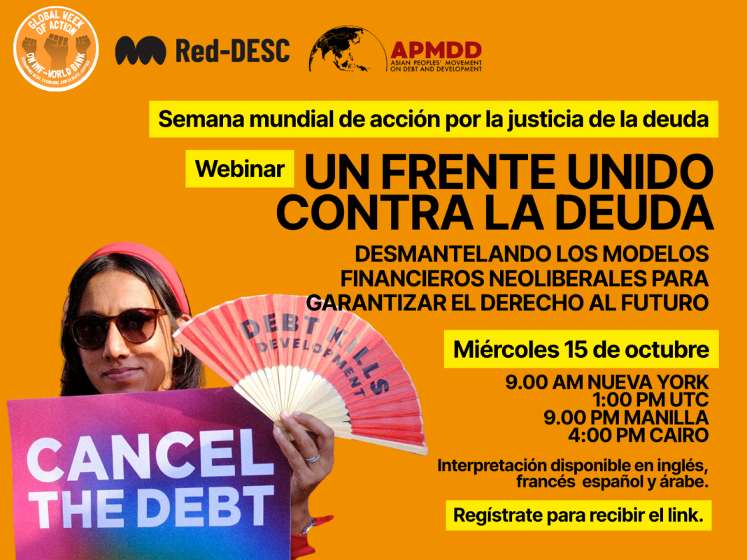 En respuesta a las próximas Reuniones Anuales del Banco Mundial y del FMI, nos uniremos a la Semana Mundial de Acción por la Justicia de la Deuda, un espacio alternativo fundamental que pone en el centro las visiones de los movimientos sociales y de la sociedad civil. Con el tema de este año “¡Basta de daños, cancelen la deuda! ¡Reparaciones y Transición Justa Ahora!”, les invitamos a acompañarnos virtualmente el Día de Thomas Sankara, 15 de octubre a la 1:00 PM UTC (tu hora local aquí). Juntas y juntos seguiremos desafiando el modelo neoliberal y neocolonial de préstamos y endeudamiento para impulsar alternativas que pongan en el centro a las personas y al planeta. |